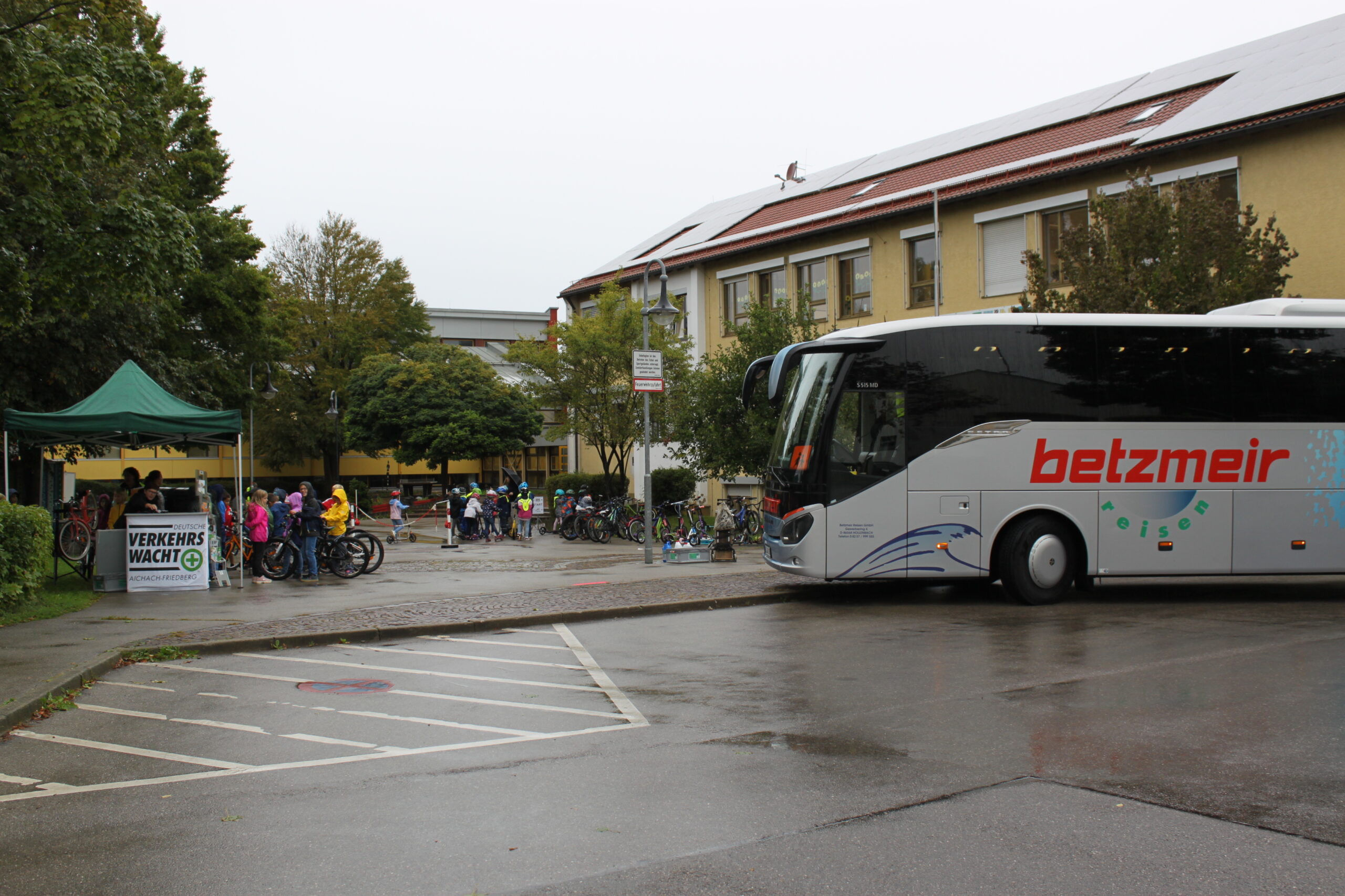 Die Erst- und Drittklässler der Grundschule Affing durften in verschiedenen Angeboten über ihre Sicherheit auf dem Schulweg grübeln. In Zusammenarbeit mit der Polizeiinspektion Aichach und dem zuständigen Busunternehmen Betzmair wurden den Kindern grundlegende Regeln beim Busfahren erläutert. Alle Kinder durften eine Fahrt mit dem Schulbus, einschließlich eines scharfen Bremsvorgangs mitmachen und wurden darüber informiert, wie sie sich sicher anstellen, ein- und aussteigen. Fahrradhelme und die Fahrräder der Kinder wurden auf Verkehrssicherheit überprüft, der Umgang mit dem Roller im Straßenverkehr wurde geübt. Zusätzlich wurde den Kindern der sogenannte „Tote Winkel“ von Autos und Lastwägen erläutert.